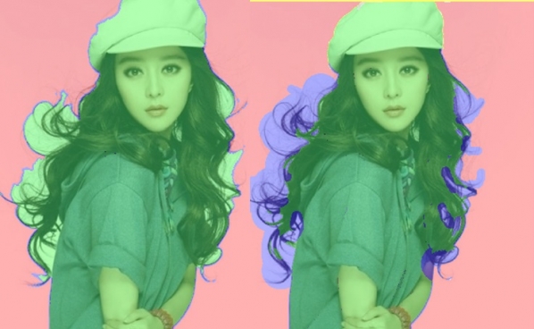 八:用紅筆5在要刪除的區域涂抹,如左圖所示。筆頭大小可以調整。用藍筆7在紅綠交界的區域涂抹,如右圖所示。筆頭大小可以調整。