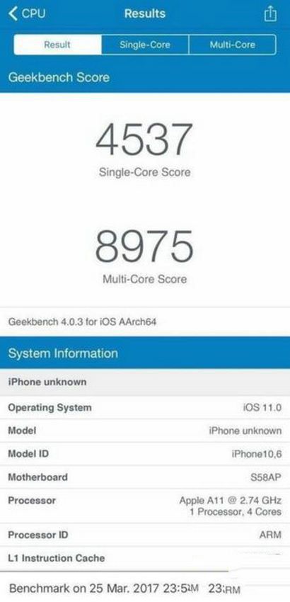 網(wǎng)友爆料,iPhone 8的A11處理器跑分已經(jīng)在Geekbeech中出現(xiàn)了。A11處理器跑分單核4500+,多核接近9000,預(yù)計安兔兔跑分破20萬。