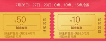 7月26日/27日/29日,0點10點15點搶券。除生鮮量版 138-50券當日使用/99-10券當日使用