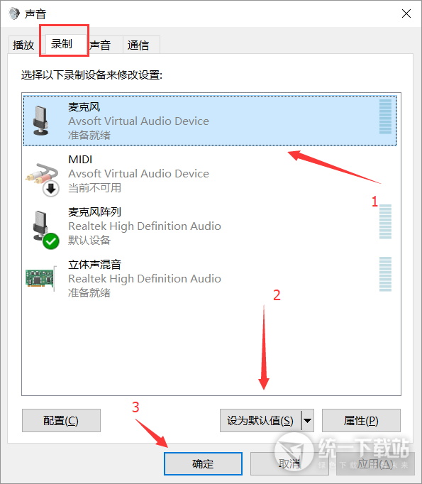 2)在彈出的聲音對話框的錄制標簽內(nèi),點擊選中麥克風(Avsoft Virtual Audio Device),然后點擊“設為默認值”>>確定。
