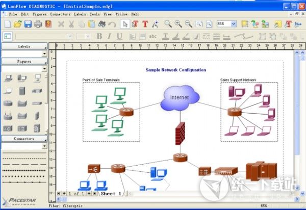 pacestar lanflow是一款使用簡單,功能強(qiáng)大的網(wǎng)絡(luò)拓?fù)鋱D制作軟件。網(wǎng)絡(luò)拓?fù)鋱D制作軟件(pacestar lanflow)和一般流程圖之類的軟件不同的是,可以讓使用者花費(fèi)不太多的力氣,就可以制作出EMF,WMF,BMP,JPG等格式的網(wǎng)絡(luò)拓?fù)鋱D。